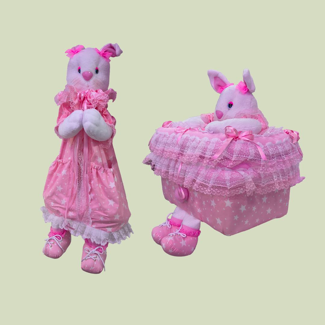 Combo de 2 piezas que consta de un cajón para guardar cosas con forma de coneja que se puede poner sobre mesitas para que quede sentado o en el piso y pañalera colgable.